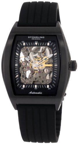 Designed with captivating originality, the Stuhrling Original Men's Special Reserve Millenia Skeleton Watch is a truly unparalleled timepiece. A must-have for any watch collector, the Millenia Skeleton features a unique inner dial that reveals the watch's inner workings in terrific black, gold, and silver tones. The dial, protected by a Krsyterna crystal, is distinguished with luminescent, silver-tone hour and minute hands boldly reiterated in the stick hourly indexes of the outer dial and the exquisite, black PVD stainless steel case and bezel encasing it in a tonneau shape. The band is black rubber with handsome inlaid striping and a convenient fold-over push-button clasp. Paramount in quality and style, this sophisticated instrument boasts water resistance to 165 feet, reliable automatic movement, and a distinctive Stuhrling gift box for an elegant presentation.